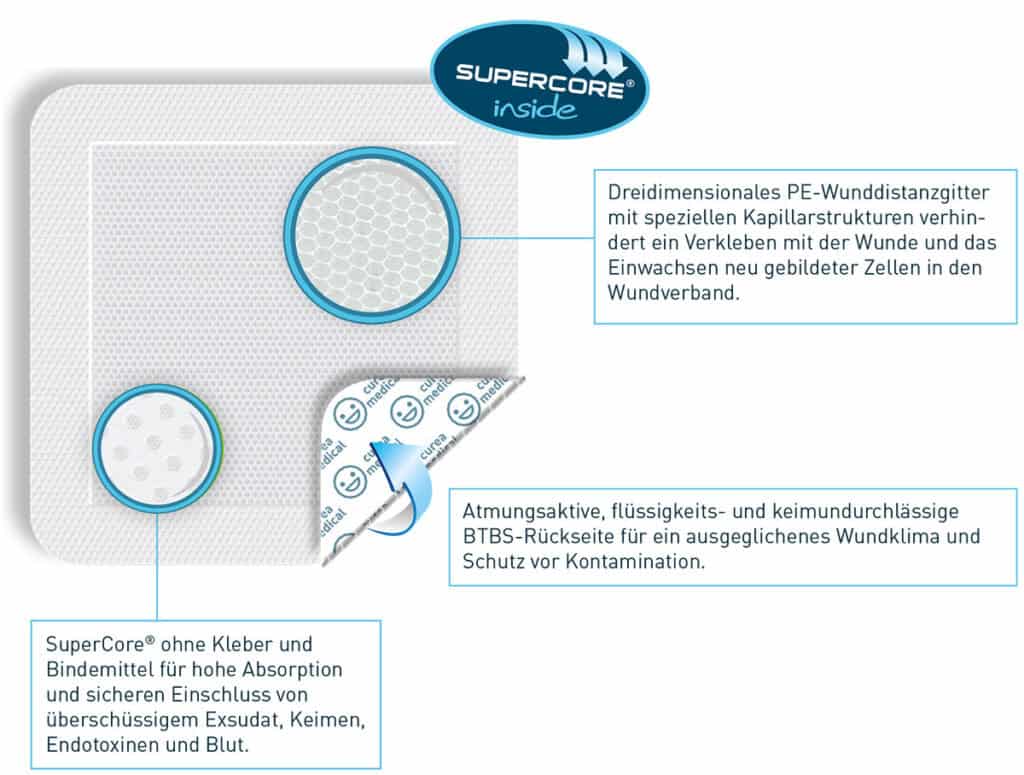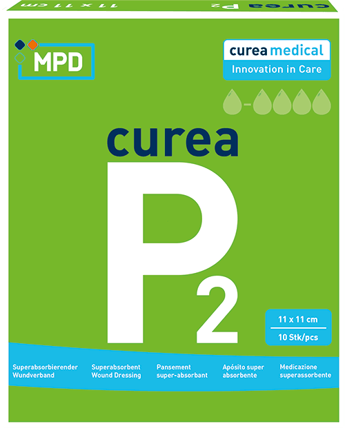 curea P2 is particularly suitable for light to heavy exuding wounds where the sensitive wound surface should be protected. The integrated wound spacer prevents sticking to the wound and reduces pain during dressing changes.